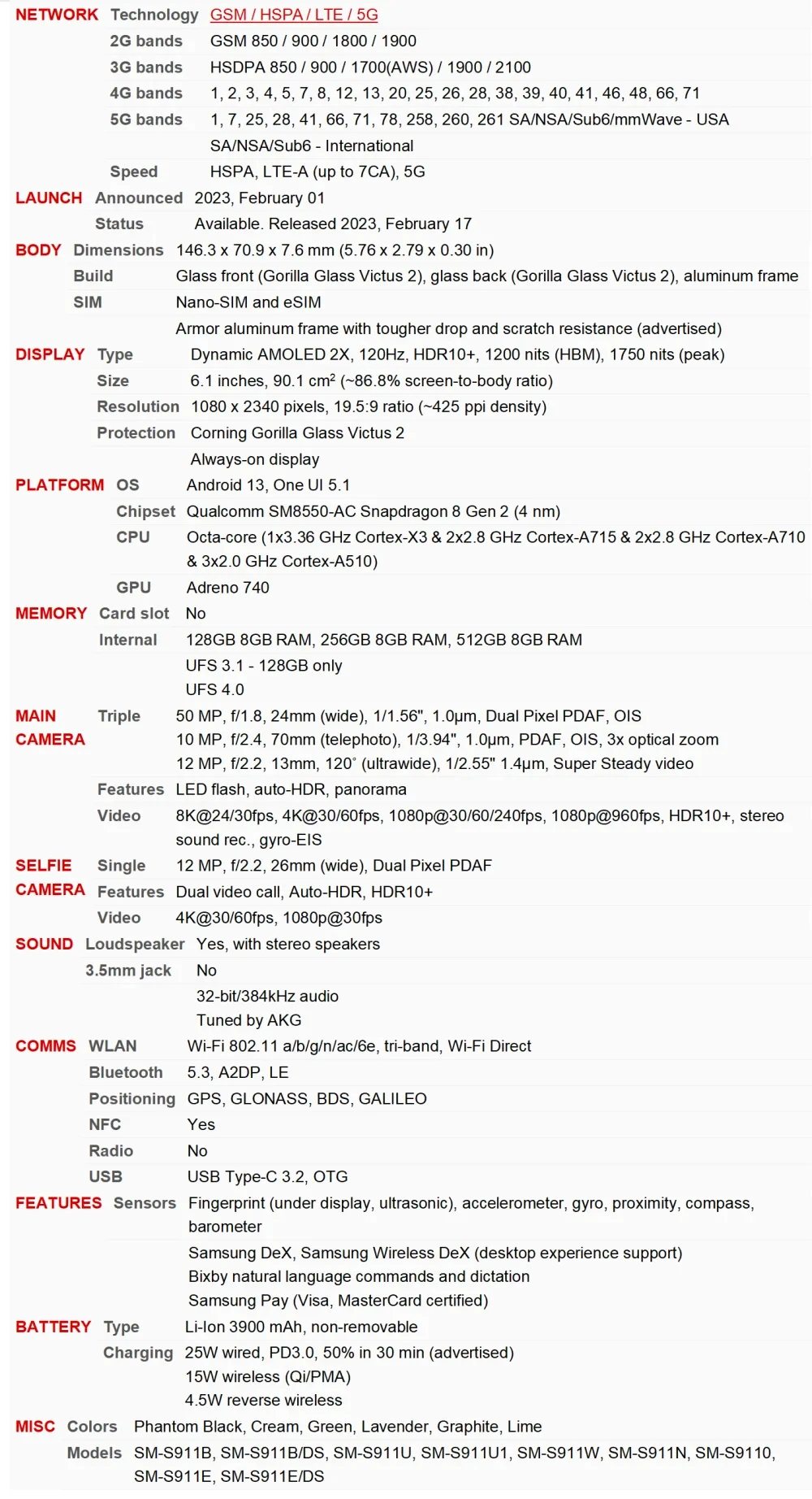 Samsung Galaxy S23 5G Specifications